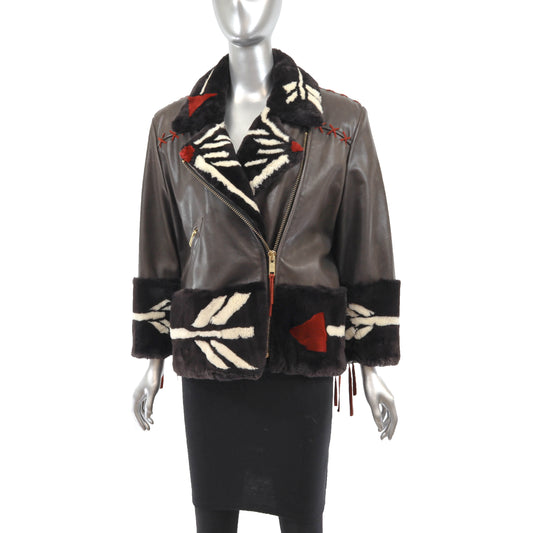 Brown Leather Jacket with Sheared Beaver Trim and Design- Size M