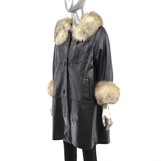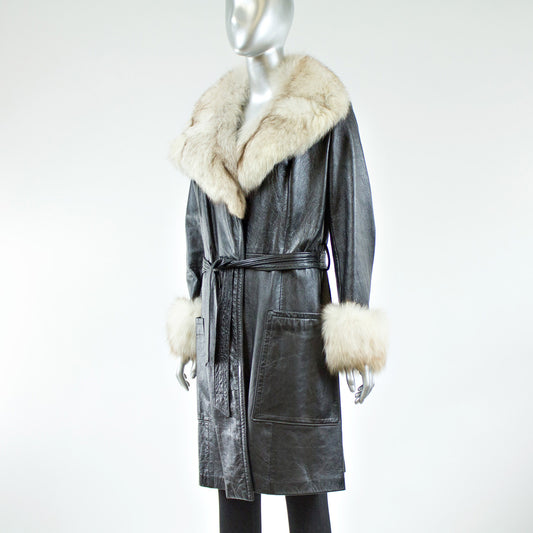 Black Leather with Blue Fox Fur Collar and Cuffs Coat - Size S