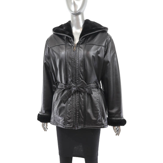 Hooded Leather Jacket with Faux Fur Lining- Size M