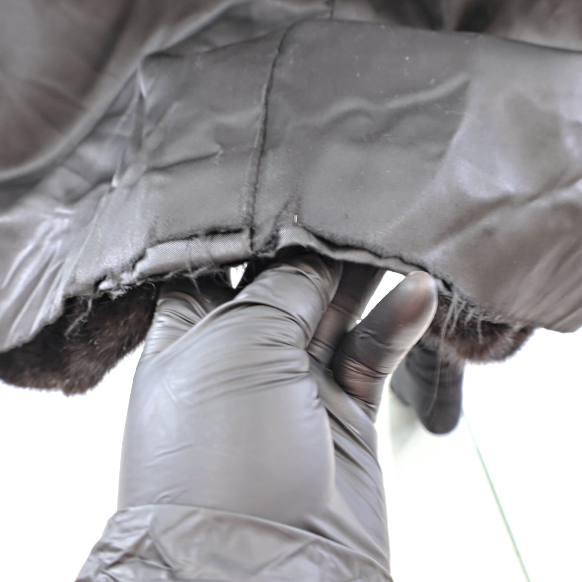 Worn out lining at the bottom hem.